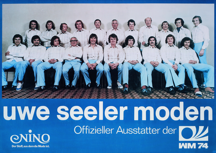 Fußballweltmeisterschaft 1974: Erneut präsentiert sich NINO als Ausstatter der Fußballnationalmannschaft. Bei der WM in der Bundesrepublik in Zusammenarbeit mit dem Hamburger Sportbekleidungshersteller „uwe seeler moden“. Ein Unternehmen, dass der langjährige Mittelstürmer und Kapitän der Nationalmannschaft, Uwe Seeler vom Hamburger SV, nach Ende seiner Profikarriere gründete. Über die gesamten 70er Jahre hinweg reiste Uwe Seeler regelmäßig nach Nordhorn, um bei NINO die Stoffe für seine Sportbekleidung einzukaufen.